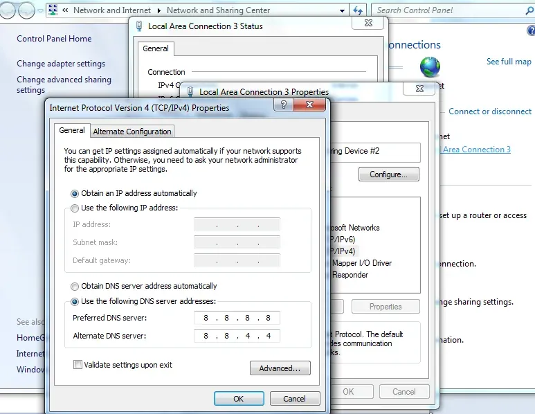 Oke langsung saja, untuk membuka situs yang gagal dibuka walau sudah gonta ganti APN. coba anda gunakan DNS google "8.8.8.8" dan "8.8.4.4" disini letaknya :