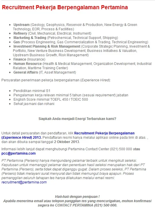 Sumber berita info lowongan kerja ini dari sini : http://pertamina.com/Experience_Application.aspx