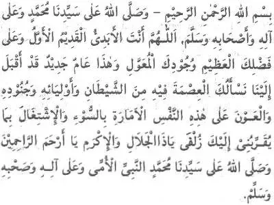 وَصَلَّى اللهُ عَلَى سَيِّدِنَا مُحَمَّدٍ وَعَلَى اَلِهِ وَصَحْبِهِ وَسَلَّمَ اَللَّهُمَّ اَنْتَ اْلاَ بَدِيُّ الْقَدِيْمُ اْلاَوَّلُ وَعَلَى فَضْلِكَ الْعَظِيْمِ وَكَرَمِ جُوْدِكَ الْمُعَوَّلُ وَهَذَا عَامٌ جَدِيْدٌ قَدْ اَقْبَلَ اَسْأَلُكَ الْعِصْمَةَ فِيْهِ مِنَ الشَّيْطَانِ وَ اَوْلِيَائِهِ وَالْعَوْنَ عَلَى هَذِهِ النَّفْسِ اْلاَمَّارَةِ بِالسُّوْءِ وَاْلاِشْتِغَالِ بِمَا يُقَرِّبُنِى اِلَيْكَ زُلْفَى يَاذَالْجَلاَلِ وَاْلاِكْرَامِ وَصَلَى اللهُ عَلَى سَيِّدِنَا مُحَمَّدٍ وَعَلَى اَلِهِ وَصَحْبِهِ وَسَلَّمَ